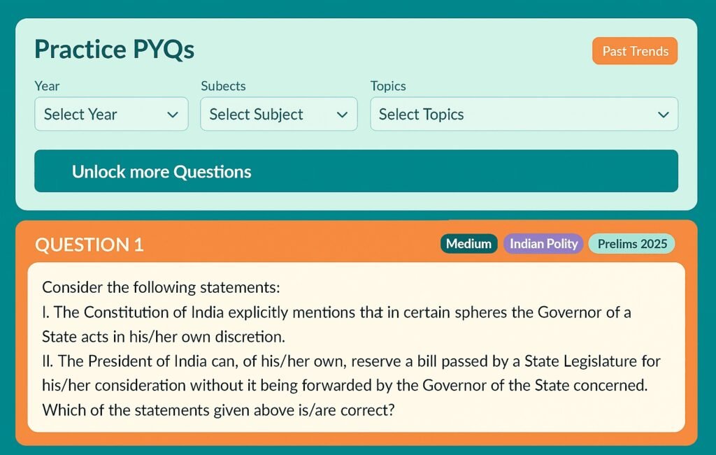UPSC Prelims Syllabus & Recommended BooksUPSC Prelims Syllabus. Daily Quiz (Current Affairs)5 Most relevant News -> 5 Questions -> Current Affairs Ready Daily Quiz (Static)Test -> Revise -> Repeat -> Perfection Score Booster Notes: StaticFilter the noise and boost your score. Express Revision NotesMnemonics, Mind-maps and Tables for last month revision of entire Prelims Static syllabus. Prelims 2026 Desi Dangal (Test Series)Simulate the real exam, Covering the full syllabus, current affairs, and CSAT. CA1000-Prelims CourseCover entire year Current Affairs for Prelims 2026 in just 1000 Points (Video Lectures and pdf.) Practice Prelims PYQsPractice Subject Wise & Year Wise Prelims PYQs. PYQsDownload Subject Wise and Year wise UPSC Prelims PYQs.